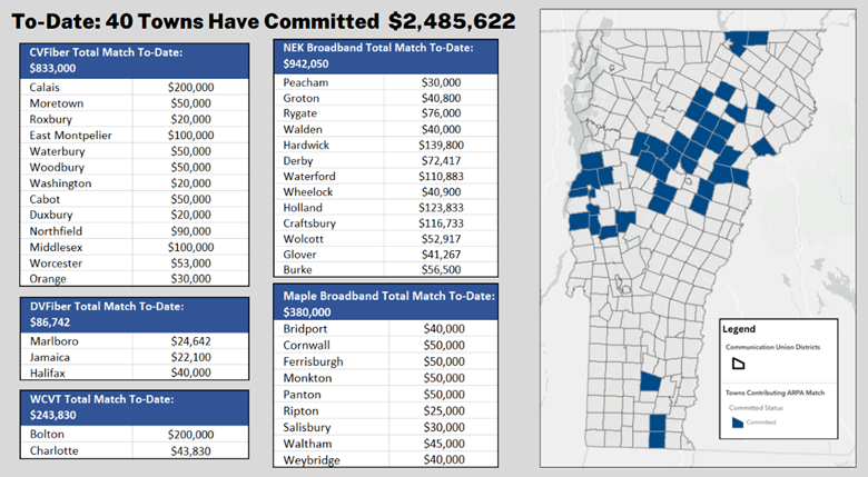 Town pledges will be matched up to $100,000 per town. The Local Fiscal Recovery Funds must be provided to the Communications Union District (CUD) serving the town or to an eligible provider in towns that are not members of a Communications Union District. The CUD or the nonmember towns must be participating in the Act 71 Broadband Construction Grant Program to receive the match. Towns must pledge the funds before May 31, 2023, to be eligible for the match.