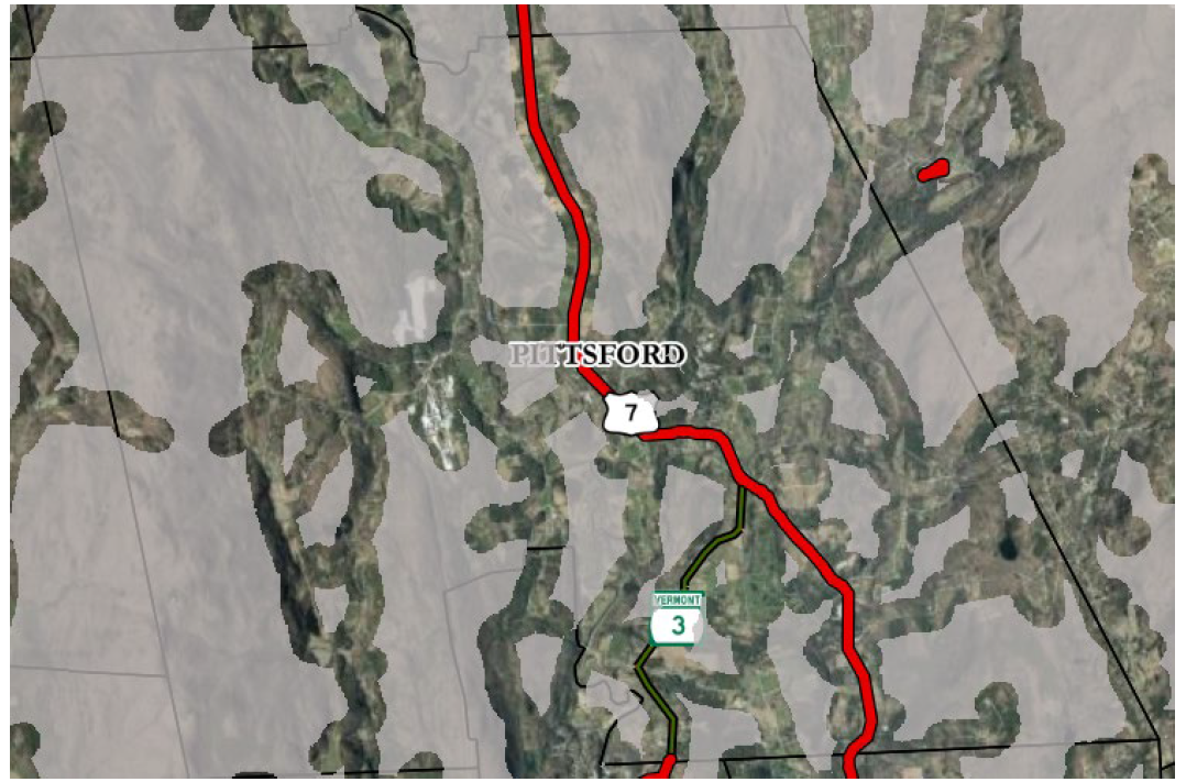 Tier 3: includes“habitat connectors”, new areas around roads where the majority of land on both sides has tree canopy and is considered a high priority forest connectivity block (per Vermont Conservation Design). This may include significant stretches of state highway and Class 2 roads.