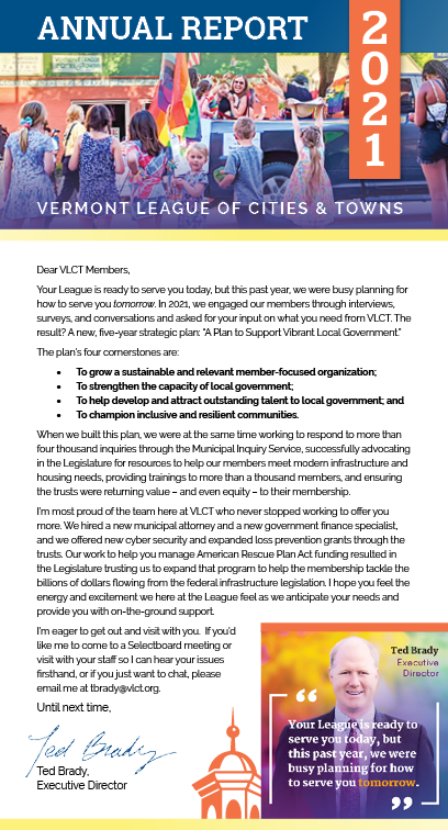 The VLCT 2021 Annual Report is a brief summary of the League's activities and finances for 2021. You will find more information about VLCT in general and its 2021-2022 accomplishments in the VLCT 2022 Member Guide. The complete 2021 Audited Financial Statements file is available on our Audit Reports page.