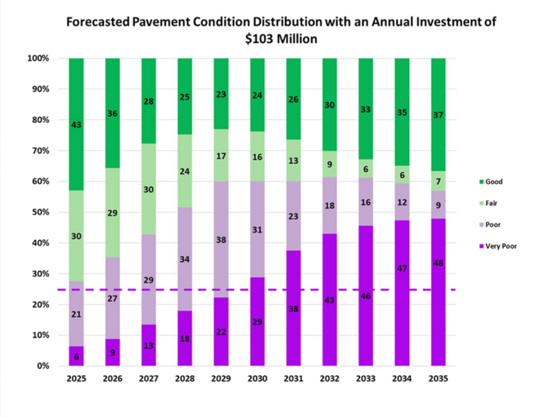While both transportation committees have acted this biennium to ensure that future town highway funding is level and to close the overall revenue gap in the transportation fund, the problems caused by chronic underfunding for transportation are already severe. The Vermont Agency of Transportation has forecasted that at current funding levels, half of all paved roads will be in poor or very poor condition by 2035.